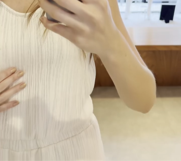 Decote em "V" discreto, que valoriza o colo com delicadeza.