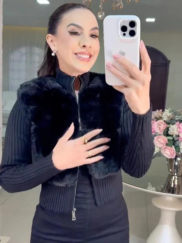 Casaco Sophie – Tricot com Pele Sintética Premium - Preto