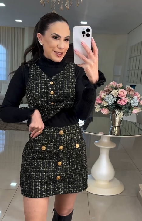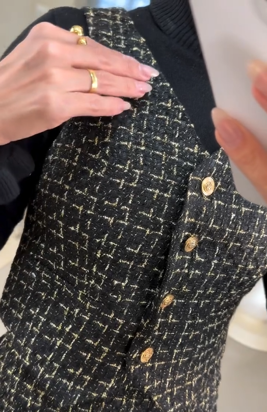 🖤 Conjunto Tweed Clássico – Colete + Saia com Botões Dourados