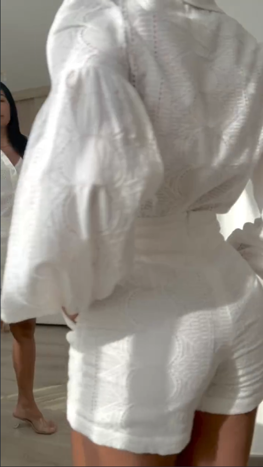 O short de cintura alta acompanha a produção com a mesma proposta de tecido bordado, modelagem ajustada ao corpo e cós largo que valoriza a silhueta, trazendo equilíbrio entre sensualidade e delicadeza.