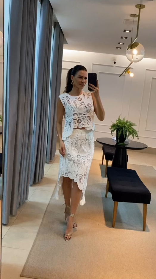 🤍 Conjunto em Renda Guipir – Cropped + Saia Midi 🤍
