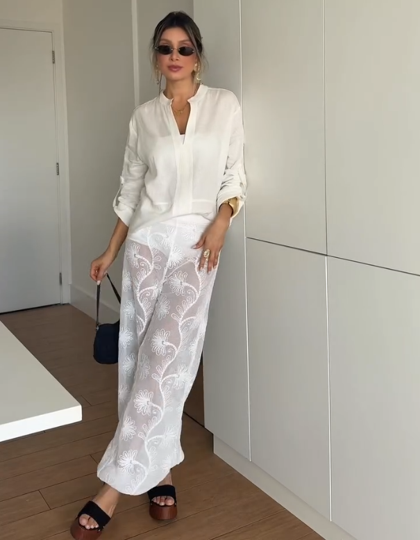 Conjunto elegante e fashion! Camisa leve + calça em tule bordado transparente, com flores delicadas que trazem charme e ousadia ao look. ✨👗